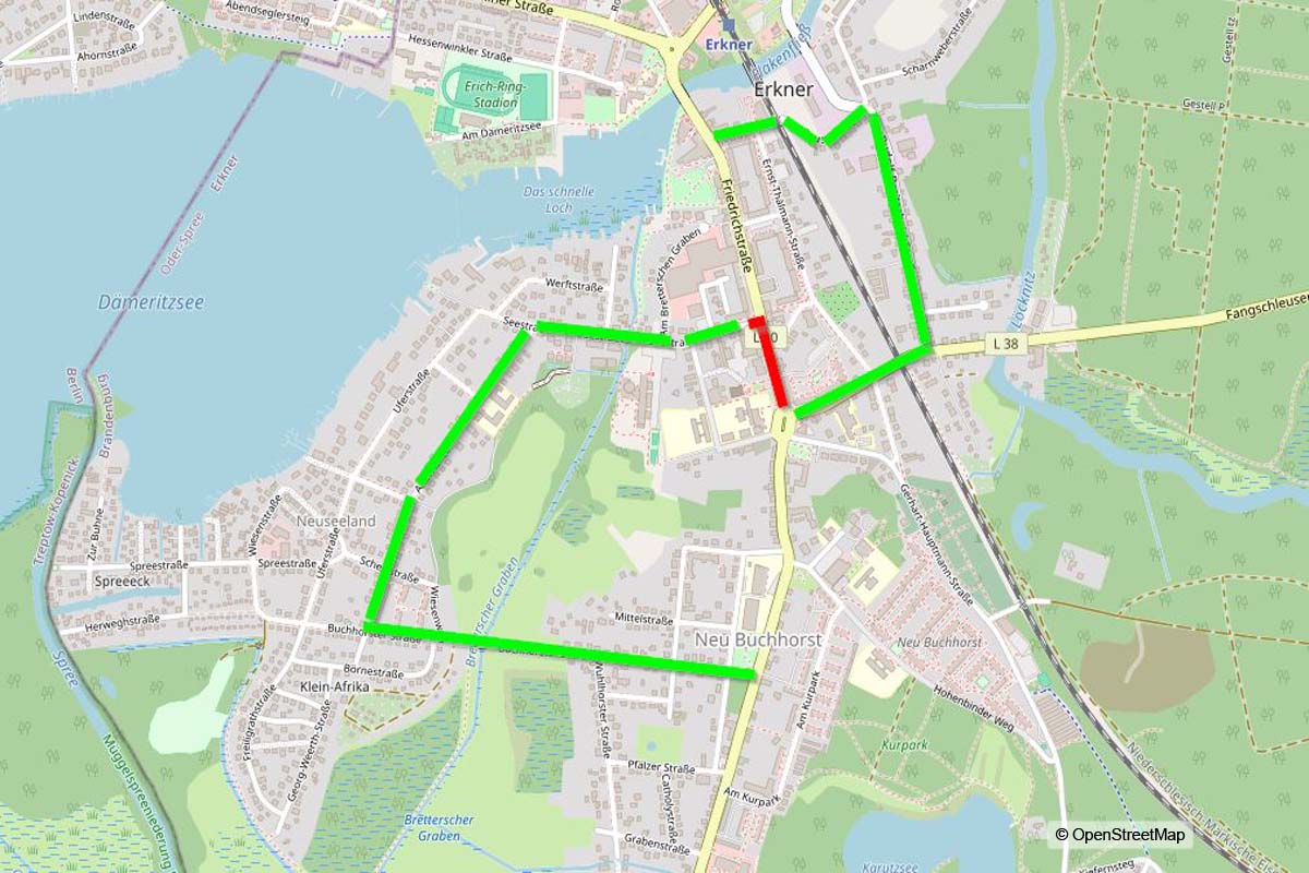 - Fahrzeuge erreichen die Löcknitz-Grundschule, das Bildungszentrum oder das City Center über die Umfahrung Buchhorster Straße – Ahornallee/Uferstraße – Seestraße.